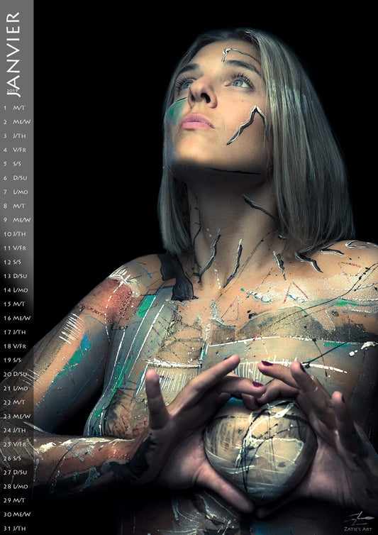 The calendars are made by Zatié. He does the bodypainting (painting on the body) as well as the photo shoot session. The main objective of these sessions is to work on letting go and self-esteem. So if this message resonates with you, we invite you to contact us for more information.