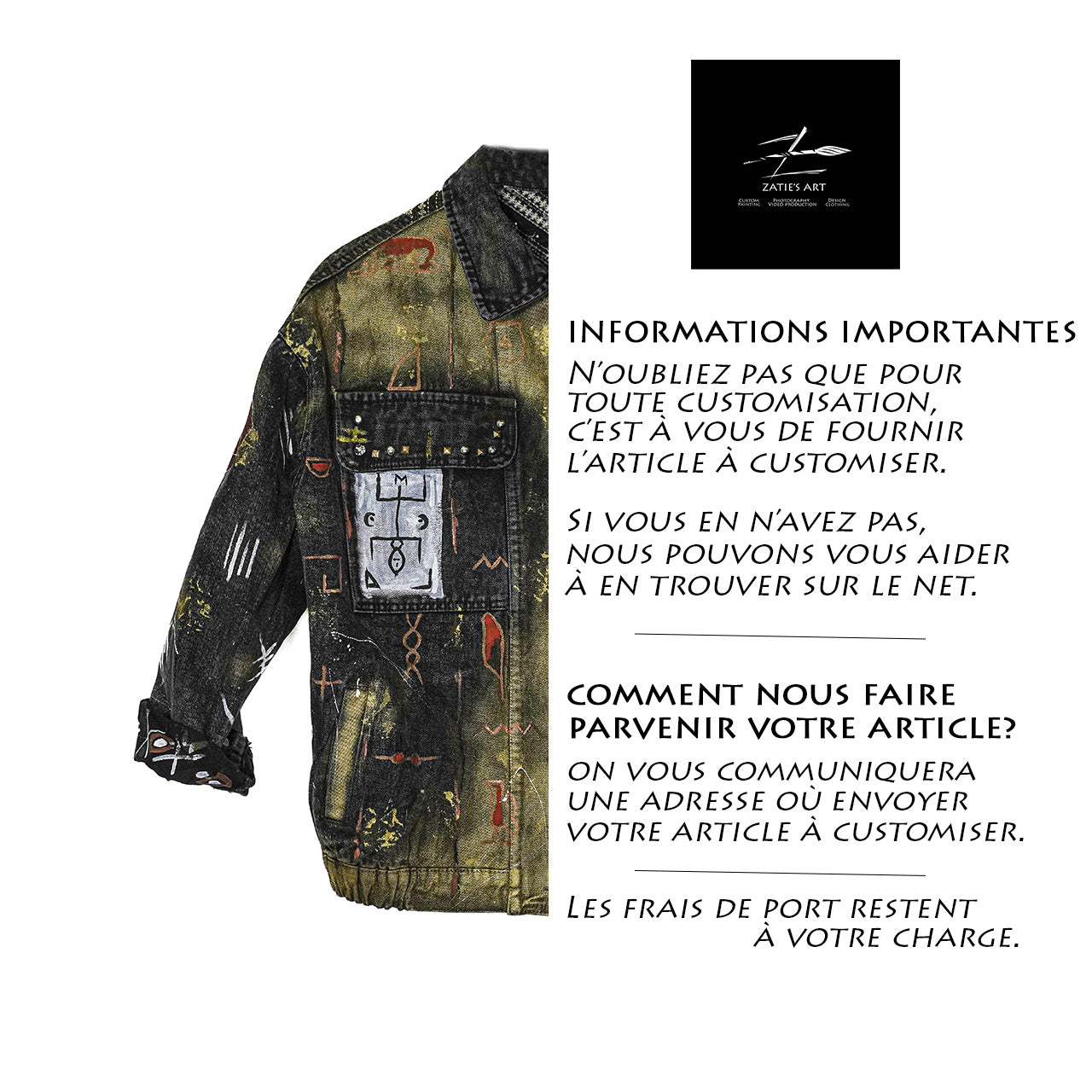 Pour toute customisation, c'est à vous de fournir l'article à customiser. Si vous n'en avez pas dans votre garde-robe, nous nous ferons un plaisir de vous aider à en trouver sur le net.